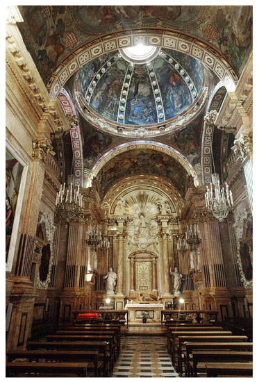 Nearly every village, nearly every corner of the Peninsula, had its own advocation to Our Lady. In the case of Tortosa, which had been recently reconquered, this devotion was to the Virgin of the Girdle, thanks to yet another numinous apparition. According to tradition (), on the night of 24–25 March 1178, the Virgin appeared to a canon who was about to celebrate Matins in the cathedral but was late amid Te Deum. She gave him the girdle that bound her mantle with the following words: “Et quoniam in honorem filii mei, et meum haec Ecclesia est constructa, et vobis Dertusensibus curae est me plurimum venerari, ideo quia diligo vos, pro quibus meum ad filium intercedo, soluens Cingulum, quo praecingor, a me fabricatum, super Altare illud pono, et vobis trado: ut hoc in pignus amoris mei memoriam habeatis”. () (And since this church was built in honor of my Son and in mine, and because I love the people of Tortosa who take care that I should be highly revered and for whom I intercede with my Son, loosening the girdle with which I gird myself, made with my own hands, I place on the altar. I give it to you so that you may keep it as a sign of my love). From then on, especially since the 17th century (), this relic has been the subject of strong devotion in Catalonia and throughout Spain as a miraculous gift, also on the part of both the Habsburg and Bourbon monarchs. For instance, from 1629 to modern times, it was customary for queens of Spain to receive the reliquary with the Girdle as a means of protection during childbirth, while Felipe V was the first monarch to be a member of the Archconfraternity of the Virgin of the Girdle (; ). Precisely, the support of the Crown was decisive for the construction of a majestic chapel (Figure 1) in honor of the Virgin of the Girdle to guard the relic in the cathedral ().