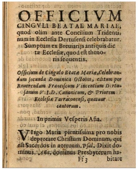 However, where are the medieval chants for the Virgin of the Girdle? We know that in 1508, bishop Alfonso of Aragon and the Cathedral Chapter of Tortosa jointly commissioned an Officium Cinguli Beate Marie, suntum ex breviario antiquo Ecclesie Dertusensis1 (Figure 2) (; ; ; ) (Office of the Girdle of Blessed Mary, taken from the ancient breviary of the Church of Tortosa) from Francesc Vicent, prior of Tarragona (), for a new proper worship on the second Sunday of October, but we have no trace of earlier chants directly related to the Girdle… Does this mean that it was not venerated before in Tortosa?