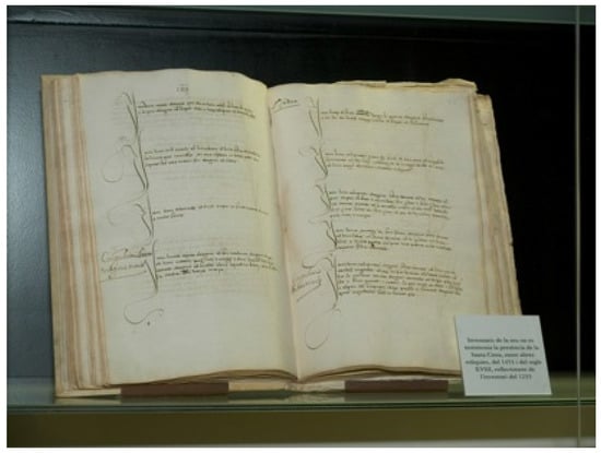 For the first time in 1347 (and later also in 1363), the “Inventari Antic de les Sanctes Relíquies” (Ancient Inventory of the Holy Relics) from Tortosa (Figure 3) recorded these practices as follows: