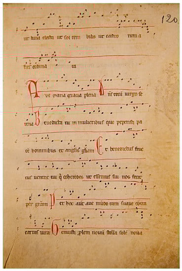Incipit of Ave Maria/gratia plena, first sequence of the Marian appendix (E-TO 135, f. 120r). @ Tortosa Chapter Library. Picture used with permission.