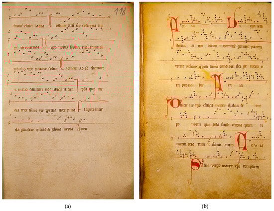 The organization of the manuscript (Appendix A) is established by collections that develop without interruption, followed by our appendix: Kyrie (ff. 1–9v), Gloria (ff. 9v–15v), Sanctus (ff. 15v–32v), four Episcopal blessings (ff. 32v–33r), Agnus Dei (ff. 33r–39r), sequentiary or proser (temporal, sanctoral, and common) (ff. 39r-118r), and Marian appendix (ff. 118v–144v). Each section change is marked by an illuminated initial of the first piece that starts a new collection (for example, the sequentiary: Figure 5). This occurs in all cases except in the appendix, which was added by a contemporary hand (Figure 6b): it is precisely where the sequentiary ends (f. 118r) and the appendix begins (f. 118v)—the only point of the manuscript in which this continuum is interrupted, since the sequentiary ends in the sixth line of the folio (Figure 6a). That is, there is a clear intention to separate the Marian appendix as a section apart from the rest of the manuscript.
