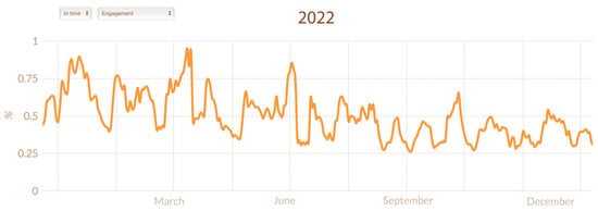 In order to find out the incidence that the publications posted by the extreme right party, Vox, had on Twitter users, we have chosen to analyze the level of engagement of the most viral messages during the observed year. The greater the level of engagement of a publication, the better it has connected with the audience in terms of the digital conversation generated and the number of interactions it instigated among users. The average level of engagement of the official Vox account during 2022 was 0.478%. Although this is a comparative metric, on Twitter—in general terms—a good level of engagement is considered to be between 1% and 2% (see Figure 2).