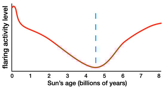 Figure 2 shows the Sun’s past and present flaring activity levels and its future flaring activity levels, as determined from observations of the most Sun-like stars spanning ages from 0.1 to 9.0 billion years. Only when the Sun is about 4.57 billion years old is its flaring activity sufficiently low to permit the emergence of high-technology civilization.