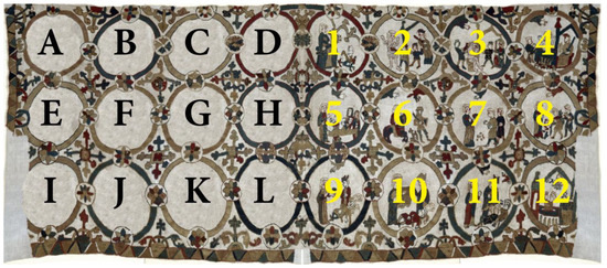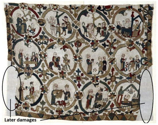 Figure 2). These features indicate that the cloth has been cut on the left side. The cloth also appears to have been cut short at the bottom, where the pattern does not match the diagonal band that was clearly placed on the garment after it was originally made. The cloth may indeed have creased, and the bottom border may have become uneven when the diagonal band was added to it, but this is not the case for the left edge. It is not inconceivable that the diagonal band belonged to the original cloth and was sown back onto a shortened cloth to be used as an antependium. Reuse of the type that can be seen on the textile is not uncommon. It was customary to reuse anything that had any value in it, whether clothes, artifacts, or building materials. This was the case in the past as much as it is nowadays.