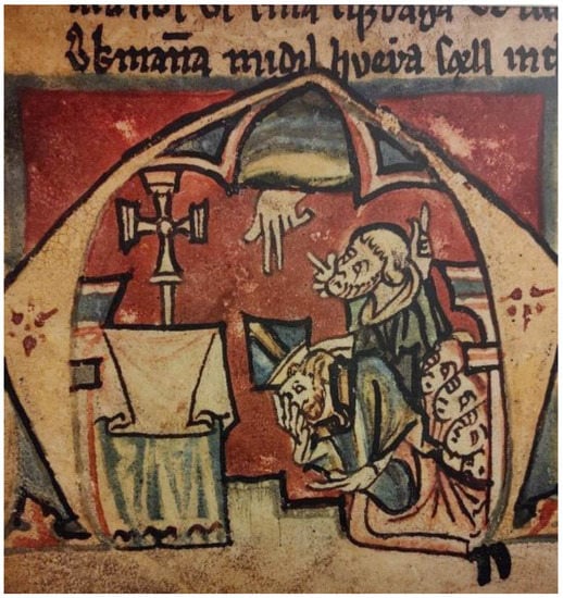DI VIII 1906–1913, pp. 64–65). Magnús was the abbot of the Helgafellsklaustur monastery when Björn was buried in the monastic cemetery there, but Magnús became the bishop of Skálholt only seven years later, in 1477. Ólöf was well-known for refusing any call to donate wealth to the church, so this was out of character. It is worth noting that, according to the fragment of Ólöf´s story in this circle, the bishop did not give his blessing over the act. This would have been symbolized by three fingers held up, but above the image, God’s left hand is shown with a golden sleeve, symbolizing the transcendent spiritual world. This indicates that this particular performance was not fully acceptable to God.