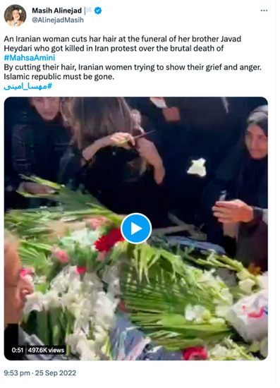 Nevertheless, despite initial police repression, protests increased. Western media outlets claimed that the Iranian regime was facing the most challenging situation in years (BBC 2022a; Tabrizy et al. 2022). As a response, Iranian authorities increased the repression to contain dissidence, and several protesters were incarcerated or died due to the repression. Hence, across social media platforms—most of them blocked in Iran—activist Masih Alinejad, on 25 September 2022, shared a video on her Twitter profile and explained that Iranian women were cutting their hair in a show of support (see Figure 1). The video showed the sister of the deceased Javad Heydari, who was shot by the police during the earliest protests following Masha Amini’s death. After this notice, at the end of September and in the early weeks of October, videos were recorded and shared throughout social media of women (first anonymous women and thereafter celebrities, such as famous French actresses) cutting a piece of their hair in support of women’s freedom in Iran in the wake of Amini’s case.