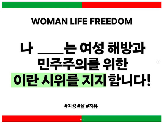 Example of the template diffused by Korean users. In English, it reads: “I work on population integration, is women’s liberation, for the sake of benevolence I support the Iran protests! #women #life #freedom”. Source: https://www.peoplepower21.org/international/1916969 (accessed on 24 February 2023).