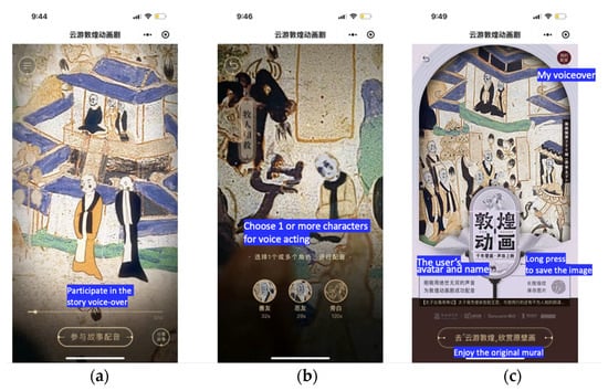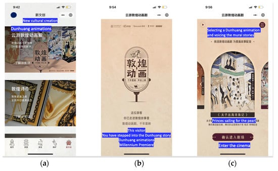 The pages of the Dunhuang Animations: (a) Dunhuang Animations in the New Cultural Creation section; (b) A description of the animation feature; (c) The selection page.