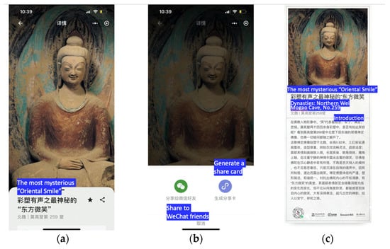 An analysis of the experience of these features related to cultural enjoyment revealed that most of the functions (E2, E3, E4, H1, N1, N3, N4, N8) supply a similar pattern of reception for users; that is, they result in sharing cards for social purposes. Unlike the obvious commercial value offered in the Dunhuang Creative Gallery (N5) and the Dunhuang Poetry scarf (N6), sharing these cards is free. Figure 6 below presents a typical example. It shows the iconic Buddha statue displayed as an art form (E2), which is described as having the most mysterious “oriental smile”. To the right of this depiction are two buttons (Figure 6a). By clicking on the star, this Buddha image can be bookmarked, while clicking on the icon on the far right reveals the two options presented in Figure 6b. The option on the left is “Share to WeChat Friends”, while the one on the right is “Generate a Share-Card”. Clicking on the icon on the right gives the user a card with an image of the Buddha and a descriptive text that can be saved to the smartphone’s album (Figure 6c). This card can be downloaded and shared on smartphones. The design of the sharing card gives social value to the user’s cultural enjoyment.