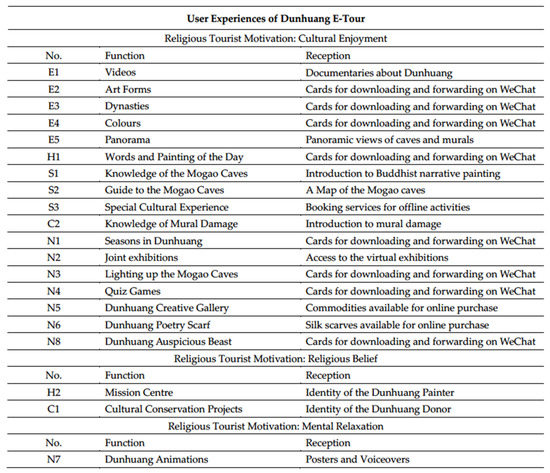 While this approach allows for data to be obtained from technical aspects, it does not enable an organised analysis of the users’ religious experience. As the content of Dunhuang E-Tour is closely engaged with religious tourism, I further modify the framework of my walkthrough method to integrate it with the perspective of religious tourist studies. In my analysis of the mini-programme’s various functions, I use three fundamental drivers of religious tourism in China in recent years, namely, “religious belief, cultural enjoyment and mental relaxation” (Wang et al. 2016, p. 57). Specifically, through the framework of travel motivation—mini-programme function—and user reception, this study analyses how Dunhuang E-Tour would cause users to receive the Dunhuang image under different travel motivations.