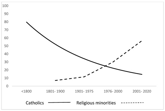 If we consider the ratio between Catholic and minority religious groups, we can conclude that, from 1976 to 2000, the Catholic Church established parishes which represented around 56% of all established groups in that period compared to 44% of religious minorities. However, the situation changed considerably from 2001 to 2020: the Catholic Church established around 6% of new local religious communities compared to 95% of newly established groups by religious minorities.