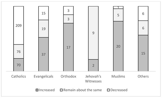 Instead, the opposite tendency was observed within the local religious groups of religious minorities, except the Jehovah’s Witnesses communities. There was a rapid growth of younger age cohorts regularly participating in the congregations of Muslim, Orthodox, Evangelical, and other minority traditions (see Figure 4 above). Around 71% of Muslim communities (20 from 26) and Orthodox communities (17 from 23), as well as the half of the Evangelical communities (37 from 71) declared the growth in the number of regularly participating children during the last ten years. Fifteen from 27 congregations of other minorities confirmed these dynamics.