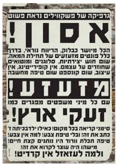 A classic example of a parodic Pashkevil can be seen in the following cited example (Figure 1). This reflective-Pashkevil mocks the morphological features of the classic Pashkevil, especially the Pashkevil’s unique font that characterizes the genre’s traditional-minimalistic design, and emphasizes and highlights the expressions of crisis and outcry. The ironic aspect characteristic of these parodic texts (Shifman 2008) is prominent, among other things, in the technique of using expressions with high rhetorical force, such as “disaster!” and “cries of the land!” that are very noticeable on their own at first glance of the Pashkevil; however, when reading the entire Pashkevil and in combination with its parodic context, these words acquire a completely reversed meaning. For example, in the Pashkevil’s first line of “Pashkevil graphics simply look disastrous!” and in the middle section of the Pashkevil: “With all sorts of stupid phrases like cries of the land!” The incongruity of the “regular” appearance of the classic Pashkevil and the inverted and reflective appearance in this context create the parodic effect of the text.