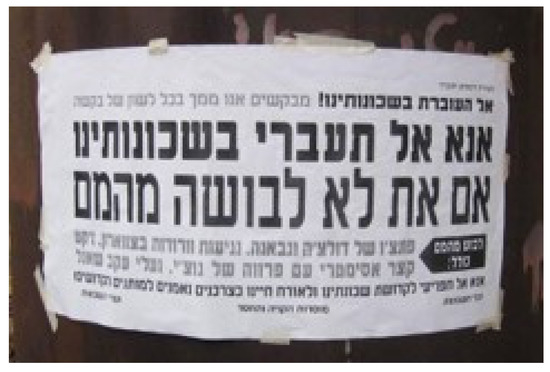 One of the acceptable “incongruence” techniques in humoristic genres in general, and parody in particular, is the “mixing of fields” technique, in which the text combines elements from one cognitive, linguistic, or textual field together with elements from another field (Palmer 1987). Raskin (1985) analyzes these texts according to the “Script Principle,” in which comic texts are characterized as consisting of two scripts that completely overlap and maintain a contrast relationship. An example of a parodic use of this technique is the humoristic Pashkevil that imitates a popular Pashkevil (which over time turned into a permanent billboard—Figure 2 and Figure 3) warning neighborhood visitors from entering in attire that does not conform to the acceptable Haredi standard of modesty.