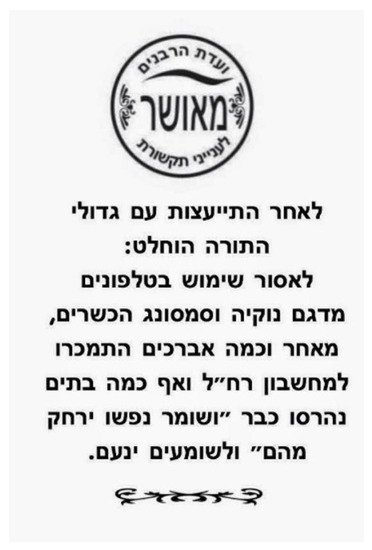 Many of the Pashkevilim are written and distributed by isolated internal Haredi groups, such as “Shomrei Ha’Chomot” (lit. Guardians of the Walls) and “Ha’Edah Ha’Haredit” (The Haredi Council of Jerusalem), or by individuals wishing to protest internal and external Haredi phenomena (Rosenberg and Rashi 2015). In this manner they function as an alternative channel—and at times even oppositional—to institutional Haredi media ruled by the “mainstream” Hassidic and Lithuanian groups and are carefully monitored by “Gedolei Ha’Dor” (lit. the generation’s greatest) and its representatives (Friedman 2005). However, in other instances the Pashkevilim are used by the “mainstream” Haredi leadership as a supplemental communication channel to the official media for distributing religious and social campaigns. For example, there has been a wide use of Pashkevilim on top of the general recruitment of the media in the public campaign waged in recent years to replace smartphones by distributing “kosher cellphones” (Rosenberg and Rashi 2015).