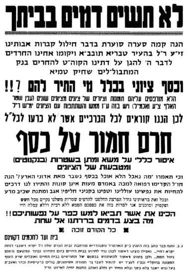 The satirical Pashkevil is characterized by its reference to common phenomena that frequently appear in new “real” Pashkevilim. Thus, the issue of female modesty, which is broadly referenced in Pashkevilim, also receives a satirical Pashkevil calling to ban women from leaving their homes entirely (Figure 7). Another example is a satirical Pashkevil protesting Haredi organizations funded by Zionists. The real Pashkevilim on this subject are usually written by the “Ha’Edah Ha’Haredit” and the Haredi religious group of “Neturei Karta” prohibiting cooperation with state institutions. This satirical Pashkevil (Figure 8) bans the use of Israeli money because it is “Zionist money”. These examples, which exaggerate to the point of ridiculing the “discourse of prohibitions,” seek to highlight the absurdity of the “ordinary” Pashkevil’s strict and extreme approach as well as its contents. In this sense, the satirical view of the Pashkevil complements the abovementioned parody effect in that both these humorous practices seek to expose the extreme characteristics of the Pashkevil, whether through its visual attributes and rhetorical style or in its radical content, and to undermine the basic infrastructures of the genre.