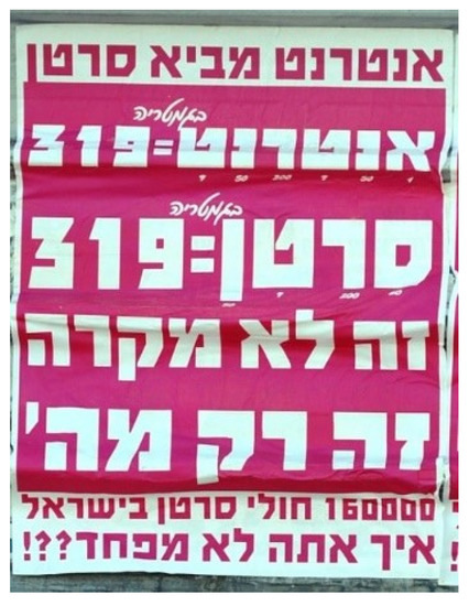 It is possible that the parodic practices found in the current study, which exaggerate the formal characteristics of the genre and mock them, reflect the infiltration of new technologies into the Haredi community. Findings from recent years indicate that while religious leaders’ ban of television gained large-scale compliance, restrictions on smartphone and Internet use proved less effective, with a penetration rate of 64% in 2020 (Cahaner and Malach 2021; Mishol-Shauli and Golan 2019). These studies suggest that the Internet offers a new religious and spiritual environment, providing a valuable prism for observation of numerous processes in the networked society (Okun and Nimrod 2017). In this state of affairs, Pashkevilim seem to be a particularly archaic communication channel, and their distinct style is an object of ridicule and criticism.