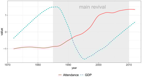 Child attendance and GDP per capita in Georgia, 1972–2012. Note: GDP per capita in USD, scaled; percentage of individuals with at least monthly attendance as a child, scaled; attendance is an eight-step variable ranging from eight (more than once a week) to one (never); shaded area indicates time of strong religious revival. Source: Stolz et al. (2023).