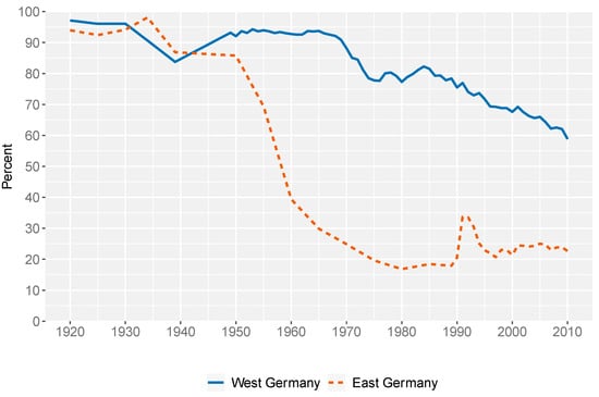 Figure 3 shows how official action depressed child baptism from 1950 onward in East Germany. The removal of state repression in 1990, once the two Germanies were no longer separated, led to a clear but only transitory upswing in the East (Stolz et al. 2020).