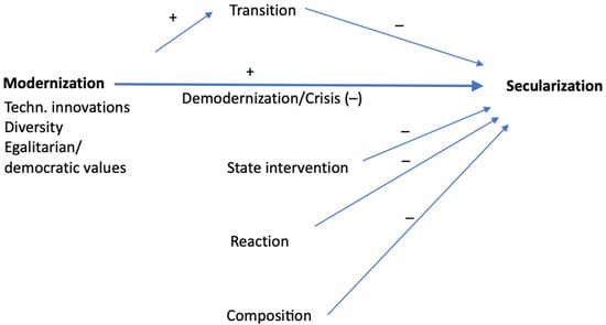 We define secularization as the decline of the importance of religion and religiosity in a country or region on a societal, organizational, and individual level (Dobbelaere 2002; Pollack and Rosta 2017; Stolz 2020b; Bréchon 2013). Secularization can be seen, for example, in the declining presence of religion as a guiding principle in the constitution and the laws of a state, in the shrinking extent to which religious groups interfere in the social practices of a society (e.g., education, health provision, science, politics), and in a decline in religiosity, such as religious belief, practice, and affiliation of individuals (Zuckerman 2008).2
