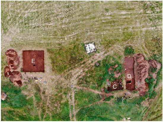 Overview of the excavation area at Þingeyrar in the August 2022, with excavation areas labelled C, D, and E.
