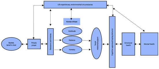 Causal pathway linking private prayer to emotional health. Adapted from () “Theoretical model of causal pathways for mental health (MH), based on Western monotheistic religions (Christianity, Judaism, and Islam)”.