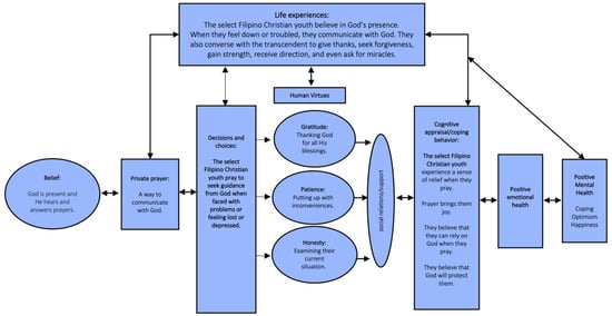 This study reveals five important insights regarding the intimate relationship between prayer and mental health among select Filipino Christian youth. Firstly, prayer is a way to communicate directly with God during difficult times. According to (), prayers to God can change things. When people believe in and communicate with God, the individual feels a great sense of internal control of the external agents, especially in times of crisis. Communicating with God helps individuals overcome problems because they believe God is in control. Secondly, they pray before making important life decisions and choices. () pointed out that young people seek the guidance of God through prayer, especially during uncertain times. Praying to God can give a subjective sense of control over events, and can positively influence the situation. Hence, prayer is important for individuals (). Thirdly, prayer allows them to express gratitude to God, examine themselves (self-reflection), and persevere, despite their sufferings. Studies show gratitude confers positive benefits, including interpersonal, emotional, and physical flourishing (; ). Through prayer, the select Filipino youth feel grateful for the blessings they receive and experience positivity in life. Fourthly, prayer evokes positive emotions, such as relief and joy, in times of distress. It has been shown that the experience of prayer can help neutralize negative emotions and boost positive emotions. This can serve as a life-enhancing factor for the individual to cope with stressful situations (). Lastly, prayer gives them a sense of security from God. In the study of (), the participants claim that they experience support and guidance through prayer. They believe that God is in control, and they are secure and protected amidst uncertainties. () assert that “culture affects perception and cognition at both the social and individual levels” (p. 6). As such, the researchers argue that private prayer, an important marker of Christian identity, contributes positively to mental health among religiously involved Filipino Christian youth.