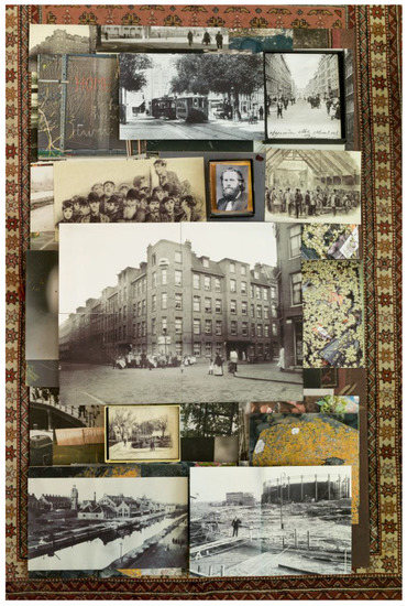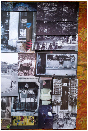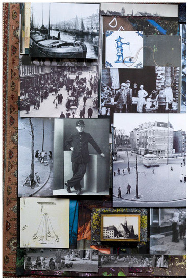 Fundamental to A(t) home in the Staats was storytelling, which continued during all three phases of the exhibit: the preparation, the exhibit itself, and the closing debate. Artistic methods were used to stimulate the sharing of memories, experiences, and expectations concerning ways of belonging to the neighbourhood. In the preparatory phase, twelve local residents were interviewed. They were selected to reflect the diversity in the neighbourhood. Criteria were: gender, age, income, lifestyle (living as a family, single, in a network, isolated, or on the street), and how long they had been living in the neighbourhood.31 Apart from being interviewed, the interviewees were photographed at a favourite spot in the neighbourhood by Peter Valckx. Their portraits were displayed in the church during the exhibit and their stories and photos were published in a one-time magazine, which functioned as the catalogue of the exhibit (Dorssers and Meijers 2021). During this first phase, some participants dived into the archives of the city, the church, and the neighbourhood, and collected texts and images which constituted the raw material for a series of five collages made by one of the participating artists, Philippe Velez McIntyre, who was assisted by a few others from the group. The first collages give an impression of the period between 1880 and 1930 (Figure 1, Figure 2 and Figure 3), the second tells a story of the 1950s (Figure 4) and the third shows the 1970s and 1980s, the time of the squatters (Figure 5 and Figure 6). The next collage portrays the work of the church, of Church & Neighbourhood, and many of the people involved (Figure 7 and Figure 8). The last collage focused on the housing issues due to gentrification and used a recent demonstration against the lack of affordable houses in the city as a theme (Figure 9 and Figure 10). An extra collage shows the beginnings of the church, which was built after a design competition for architects (Figure 11).
