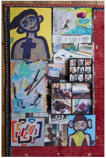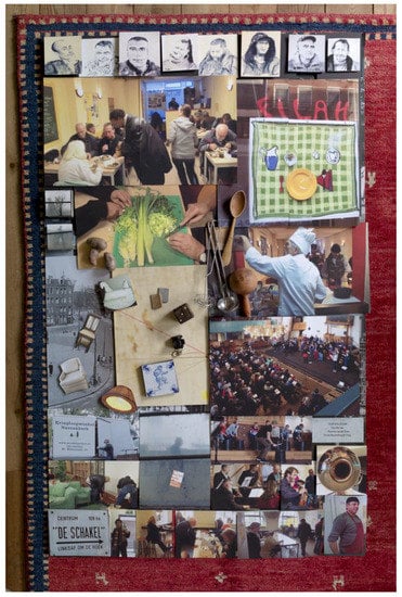 There are many different names for this kind of art: engaged art, political art, community art, collaborative, and participatory art (Malzacher and Staal 2021).1 They are all related to what has been called the “social turn in art” (Bishop 2005). In this article, I follow community artist Francois Matarasso (2019, p. 48), who uses the term participatory art to indicate the whole river of collaborative practice in which artists work with others to make art and community art to indicate an approach characterised by the aspiration of emancipatory social engagement. This description of community art is in line with the aim of diaconia to contribute to liberation and dignity, as described above. According to An van den Bergh (2012), community art helps to imagine other worlds, empower social relations, connect different people, and renew society. Matarasso (1979, p. 83) states that cultural participation strengthens both individuals and local communities by developing self-confidence, creativity, personal growth, and social cohesion by helping especially minorities and excluded groups to develop their own stories. Albert Dzur (2010) underlines the importance of a democratic space in which citizens can learn to handle changing societies through the cooperation of professionals and laypeople. Sharog Heshmat Manesh (2022, pp. 242–48) develops the view of the cultural professional as “a witness”, based on collective reflection by professionals and lay people on their roles in public space. “Witnessing”, a concept he borrows from philosopher Kelly Oliver (2001), builds on the strength of storytelling in a community and contributes to the restoration of injustice and pain by making it visible. All these theories take as their starting point the commitment to strengthen social development and human flourishing. In diaconia, just like in community art, connecting people is a core business (Meijers and Tromp 2022), and it is often directed towards the creation of “just and inclusive communities”.2