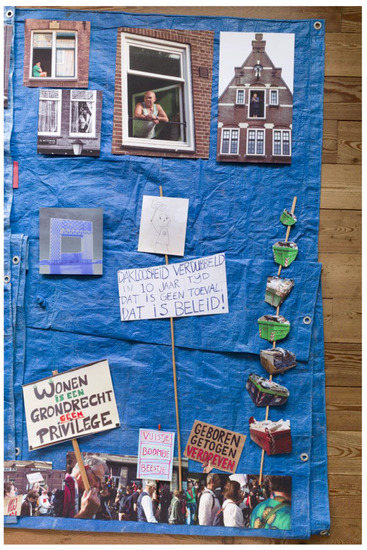 In order to investigate alliances between diaconia and community art, we will have to turn to specific situations and lived realities since, as one of the great artists of the twentieth century, Bertold Brecht, had written in big letters over his desk in his Danish exile, “truth is always concrete” (Malzacher 2014, p. 5). I therefore dedicate this article to a project in a gentrifying neighbourhood in Amsterdam, in which community art and diaconia worked together in the exhibit (T)huis in the Staats. In Dutch, the title is a wordplay: “thuis” meaning “at home”, but “huis” meaning a house and referring to the church building. For the participating Protestant congregation, this implied a question: how could the church belong to the neighbourhood and yet offer a place to people in the neighbourhood? In English, this can be translated as A(t) Home in the Staats.4 Staats refers to the name of the neighbourhood: Staatsliedenbuurt, where the names of the streets are called after statesmen. During the project (2019–2021), artistic and creative methods were deployed to generate knowledge regarding the relation of the participants to their neighbourhood and to express and define this relation anew to overcome (increasing) segregation.