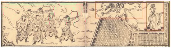 The Hell scene in the text is described as “Go up to the hall, and see the golden chair of the Kowloon. Zhongxiang sits upright on the chair and is shouted to live long by ministers. Then eight people come to present 上殿,見九龍金椅。仲相上椅端坐,受其山呼萬歲畢,八人奏曰” (). By contrast, in the image space, Sima Zhongxiang is on the right side of the illustration, sitting in the center with a flat crown, a dragon suit, a pair of worry-free shoes, a jade belt, and an oath sword. There is an official desk in front of him and a screen of the Emperor behind him. Eight attendants stand on the left and right, with long-winged hats and robes, holding Chaohu 朝笏. On the left side of the image, Hanxin and his servant kneel on the ground, with Pengyue, Yingbu, Han Gaozu, and Empress Lü standing on trial in turn (Figure 6). The image space forms the social ranking of “superiority and inferiority”. The painters constructed the “hell scene” in Buddhism. The image writing of Hell has nothing to do with the images of the Buddhist underworld, such as cow ghosts, horse faces, and snake gods. It intends to highlight the form of Confucian power, such as the Emperor, the court, and Confucian scholars. The design logic aims to manifest Confucian political order. The construction of the religious schema of “superiority and inferiority” and the behavior of “abandoning gods” symbolize the infiltration of Confucian principles and ethics and manifest the prescriptive nature of the bottom people’s thinking about religious gods. The painting of the dream of the deification ceremony adopts the same strategy. “Yinjiao Dreamed About Gods Giving Him the Axe to Destroy Zhou” in the “Book of King Wu Attacking Zhou” depicts the story of the prince, Yinjiao 殷郊. He fled from the imperial Zhaoge 朝歌 and arrived at a temple at night. He dreamed that “(gods) drank with him and gave him a big axe of a hundred jin, which was regarded as ‘the axe to defeat Zhou.’” (). As shown in Figure 7, the sleeping Yinjiao is on the right side of the illustration, and the ceremony of the gods granting the axe is painted on the left. The gods, attendants, and a table build the spatial hierarchy of the power field. The “divine axe” is granted by officials wearing long-winged hats and robes. The Taoist ritual space of “the immortals bestowing an axe on Yinjiao” was created independently from the text by the painters. The translation of the immortal images into the ritual scene of Confucian political order represents the public landscape of Confucian politics and religions. After “the prince told gods all his father’s unkind and immoral acts 太子具說父王不仁無道之事”, the gods gave him an axe to kill King Zhou, representing the image volition of the gods to change the designation of the imperial reign because King Zhou violated ethics and the Five Virtues and exhibiting the public’s recognition and acceptance of the Confucian ethics of benevolence, righteousness, and propriety. In these religious narrative images, including “King Zhou Dreamed About the Jade Maiden Giving Him The Jade Belt” and “King Wen Dreamed About the Flying Bear” in “the Book of King Wu Attacking Zhou”, “Yingbu Shot King Han” in “the Sequel of the Book of the Former Han Dynasty”, “Star Fell Down to Kongming’s Campsite” in “Records of the Three Kingdoms”, “the First Emperor of Qin Ordered Wangjian to Attack Zhao” in “Qin Merged Six Countries”, and so on, with the help of order symbols, such as the costume of the Emperor, the long-winged caps of the literary ministers, the armors and Confucian robes (round-neck robes) of the military generals, the screen of the Emperor, the plaque of the court, the trial table, and the deacon’s guard of honor, the painters of the fiction constructed the Confucian power field. The spatial form of Confucian political and religious ethics is shaped with the assistance of religious symbols, such as the immortals and Buddha fighting and the gods and demons helping the heresies, devils, ghosts, and Raksha. Therefore, the illustrations in “Quanxiang Pinghua” are the conceptual expression of the painters based on Confucian political and religious order. Through the realistic imitation of the symbol rhetoric of texts and the images of Buddhism and Taoism, they make up for the incomplete concept of the deified images of the readers while depicting the order of superiority and inferiority in Confucian political and religious concepts.