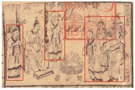 The preceding part discussed Buddhist and Taoist ritual landscapes in the illustrations of the fiction. The concepts of Confucianism, Taoism, and Buddhism manifested in the images are not singular, but a reflection of the public’s acceptance of compromised religious ideas. In religious beliefs constructed by the masses, rituals are a behavioral pattern that manifests the moral education of benevolence and righteousness. They reflect the character of the bottom people’s religious thinking. The dissemination of the institutionalized religions of Confucianism, Taoism, and Buddhism at the bottom of society has similarities with the core ideas of the folk religions in the Yuan Dynasty. Mingming Wang believed that “Chinese folk religions refer to the follows that are popular among the general public, especially farmers in China: (1) beliefs in gods, ancestors, and ghosts; (2) ancestral temples, annual sacrifices, and life cycle rituals; (3) ritual organizations of families and regional temples; (4) the symbolic system of world outlook and cosmology.” (). In the feudal society of China, with the patriarchal system as the core, the educational thinking of “fraternization”, “filial piety”, and “benevolence” formed by the compromise of Confucianism, Taoism, and Buddhism has the same characteristics as the benevolence, righteousness, and propriety advocated by the gods, ancestral beliefs, and patriarchal orders in the folk religions. The ethical concepts, such as good and evil retribution, causality, and reincarnation, represented by the religious ritual images in “Quanxiang Pinghua”, are symbols of the people’s belief in the gods, ancestors, and ghosts, as well as ethical educational thinking.