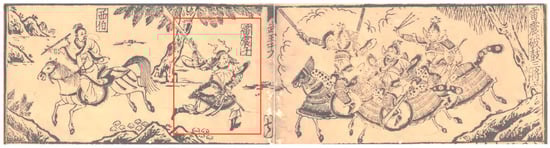 From a religious perspective, “Quanxiang Pinghua” in the Yuan Dynasty is a religious and cultural book in the Jianyang region. It blends the public’s moral and ethical beliefs in the three religions of Confucianism, Taoism, and Buddhism, such as leading to goodness and virtues. The symbols of images and texts in the fiction jointly exhibit the public’s criteria for social events. Hume pointed out that “among all the people who once believed in polytheism, the earliest religious ideas did not originate from meditation on the work of nature but from a concern for life events.” (). The illustrations of “Quanxiang Pinghua” were produced in the Yuan Dynasty when the secularization of institutionalized religions of Confucianism, Taoism, and Buddhism accelerated. The illustrations in the fiction are a visual representation of the evolution of religious history while demonstrating the public’s religious concepts about life, persons, and historical events. Focusing on Confucian political education and drawing on the ethical factors of goodness, righteousness, loyalty, and filial piety in Buddhism and Taoism, these concepts have complex ethical compositions and folk beliefs. The religious schemata in “Quanxiang Pinghua”, including sacrifice, immortals, and matching magical powers, form a set of ideographic systems of “politics and religion with moral conducts”. Its compilation reflects the generation of religious beliefs among the people in Jianyang. The illustrations of the fiction depict a large number of immortals. Worshiped by the public, these gods had additive religious colors and a fixed pattern of being created. Yinjiao, Lei Zhenzi, Guanyu, Hanxin, Yingbu, and others were all deities demoted to the mortal world. The painters used graphic symbols to display the generation and evolution of religious gods from the public’s perspective. In the “Book of King Wu Attacking Zhou”, the Taoist God, Taisui 太岁, descended to the world as the prince Yinjiao. “One day, Empress Jiang gave birth to a Prince. Because the mud god was defeated by the king, he was sent from Heaven and became Taisui”. Through depicting supernatural events, such as Yinjiao hitting Daji with a cup, obtaining the divine axe at the mountain-god temple, and beheading King Zhou and Daji, the illustrations in the fiction reflect the generation pattern of the beliefs in immortals among the bottom people, namely being born as a mortal, being loyal and filial piety, loving the people, suffering misfortunes, eliminating demons, and creating gods with beliefs. For example, the character of Taisui was shaped as an ordinary human by the painters. Moreover, Lei Zhenzi, originally belonging to the Taoist deity system, is described in the texts as having meat wings, a Thunder God’s mouth, and a black face, while in the illustrations, he is depicted as a warrior wearing armor(as shown in Figure 10). The painters drew deities as mortals to highlight their human appearances. The characteristics of the deeds of Yinjiao, Lei Zhenzi, Guanyu, Hanxin, and others are loyalty, filial piety, benevolence, and righteousness, eliminating violence, and ensuring peace for the people. This image practice of de-divinization, such as the “Empress Lü Held a Memorial Ceremony for the King of Han” in the “Sequel to the Book of the Former Han Dynasty”, the “Zhongxiang was Sent by Gods to be the Judge in the Nether World” in the “Pinghua of the Records of the Three Kingdoms”, and the “Enchanting Array” in the “Sequel to Yueyi Tried to Obtain the State of Qi”, not only imitates immortal images in “gods helping people out of doom”, “immortals giving presents”, and “gods and demons fighting with spells”, but also presents the rejection of image symbols towards immortals. Heidegger once put forward the mark of the progression of visual subjectivity, “metaphysical thinkers pursue truth. The progress in technology. Art enters the horizon of aesthetics and becomes the object of experience, and the behavior of ‘abandoning gods’”. Jianyang bookshops applied Confucian order to Taoist and Buddhist images with developed printing and engraving techniques, reflecting the practice of “abandoning gods” in the fiction’s deification narrative and marking the deconstruction and constraint of Confucian thoughts on the visual cultural field.