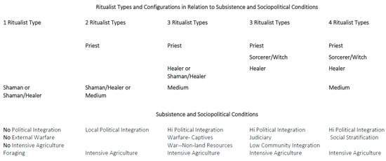 Since these ecological and social variables were not used to determine the practitioner types, the relationships provide an independent confirmation of the validity of the ritualist types presented (see Winkelman 1986, 1992 for confirmatory analyses). These ritualist types are found in specific configurations related to subsistence and political conditions, and as illustrated in Figure 1, present a model of sociocultural religious evolution (also see Winkelman 2022).