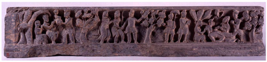 Not only has the textual tradition of the Śyāma jātaka undergone changes in the Chinese context, but the story’s visual representations found in reliefs and murals in China also exhibit a diverse range of iconography, styles, and compositions that deviate from earlier traditions in South Asia. The visual depiction of the story first emerged in India around the first century BCE, adorning monumental stūpas, and subsequently spread to major Buddhist sites throughout South Asia. For example, at the Great Stūpa at Sañchī, the story is rendered within a confined rectangular space on the inner face of the gateway pillar, with figures and elements from the Śyāma jātaka filling the space (Figure 1) (Marshall 1918, p. 73; Dehejia 1997, pp. 114–15). Surviving reliefs from the first century CE in Gandhāra (Figure 2), located in present-day northwestern India and Pakistan, employ a different narrative mode. Notably, for instance, two stair risers preserved in the British Museum show the story in a horizontal format, with scenes divided by trees that serve as a natural framing device. The staircase reliefs present three sequential scenes from the left to the right: (1) the king approaching the blind couple; (2) the king leading the couple towards the right; and (3) the couple collapsing by the body of Śyāma. This sequential arrangement demonstrates the use of the continuous, linear mode typical of Gandhāran art. In later depictions at Ajanta, specifically in murals found in Caves 10 and 17, the story is arranged according to location rather than following a strict chronological order.11