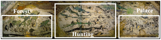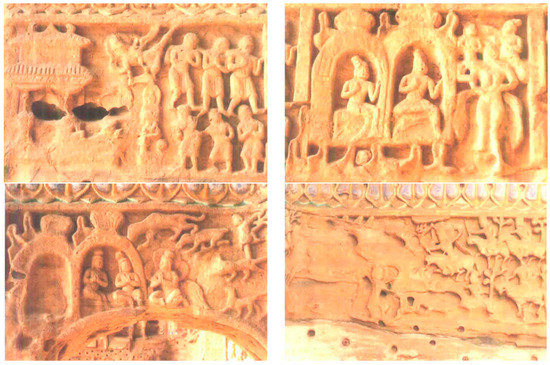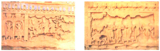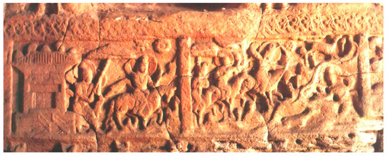 Reliefs in both Caves 1 and 9, which were excavated slightly later than Cave 7, present a more complete story in a continuous, linear mode (Figure 5 and Figure 6). Each individual scene is separated by pillars. Starting from the south wall and moving through the west and north walls, the story begins with a scene of the palace and the figures standing in a row, likely representing the king leaving the city. In the following scenes, we see the blind parents sitting in the same hut, while another figure kneels down with clasped hands and animals approaching in the background, symbolizing Śyāma leaving home to fetch water. The next cell, although partially damaged, is recognizable as the hunting scene, indicated by the arrangement of five figures riding on horses and holding bows. The last two scenes on the north wall depict the aftermath of the tragic event. The blind parents, sitting in huts, stretch out their arms, while a figure kneels down to the right side, representing the moment when the king informs the parents of Śyāma’s death.