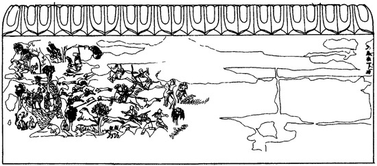 In north China, the only example of Śyāma jātaka from the sixth-century Central Plain is found carved on the pedestal of the Liubeisi 劉碑寺 Stele, which dates back to 557 CE (the eighth year of the Tianbao 天保 era), Northern Qi dynasty (Figure 9) (Wang 2006). While the right section of the relief is damaged, its middle section portrays a massive hunting scene, and the left section shows the story’s central plots. This tripartite composition is almost identical to the mural depicted in Maijishan Cave 127. This striking similarity indicates a direct influence from the Hexi Corridor, rather than adhering to the established tradition of fifth-century Pingcheng (see Figure 8). Consequently, it suggests the actual decline in the popularity of the Syama jataka in the Central Plain. Considering the geographical proximity of the Liubeisi Stele to the Central Plain rather than Maijishan, the preference for a Hexi prototype on the Liubeisi Stele may imply a lack of local references to depict the Śyāma jātaka. Thus, this circumstantially supports the argument that the Śyāma jātaka was not widely popular anymore during the early sixth century in the Central Plain.