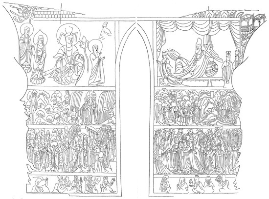 Filial stories were carved primarily on stone funerary structures, including stone coffins, mortuary couches, and house-shaped sarcophagi. The tradition of stone coffins, which prevailed during the Han dynasty, disappeared between the third and fifth centuries, only to be revived under the reign of the Northern Wei in Luoyang (Cheng 2011, pp. 191–218; Huang 1987). It is believed that the textual source for these stories during that time was the Xiaozi zhuan 孝子傳 (Accounts of Filial Offspring), a collection of popular didactic texts compiled in the early medieval period (Knapp 2005, pp. 46–82; Xu 2015; Xu 2017, pp. 105–12).34