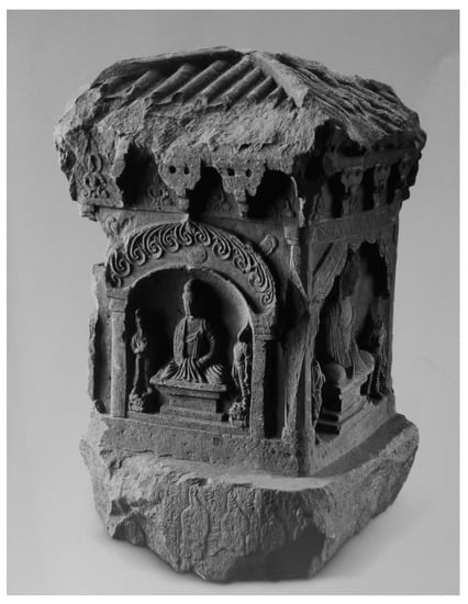 Pavilion-shaped stūpa carved with Buddhist statues. Note: Engraved during the Northern Wei dynasty (385–534); unearthed from Liquan Monastery 禮泉寺, present-day Lianhu District Xi’an, in 1987; exhibited in the Museum of Xi’an. Source: Reprinted from ().