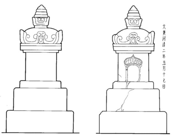 On the eastern side of the niche, the date of the construction is inscribed in smaller characters (see Figure 2). The stūpa erected for Daoping served as a funerary object. However, the inscription inscribed on the stūpa is more akin to the literary form of votive inscriptions, consisting of the name of the occupant and the date of the construction while excluding the biographical records of the deceased.