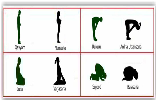 A highly practicing Muslim enjoys a busy daily routine. Modern science considers all of his actions in one day to be healthy habits. For example, a practicing Muslim will go to bed much earlier than usual because he must rise for morning prayers. He is an early riser, so he sleeps earlier at night. Because he must perform prayers five times per day, he performs ablution five times per day. Muslims are prohibited from praying prior to ablution. Daily, he cleans his teeth with Miswak, a stick of a specific tree that is beneficial for teeth. A practicing Muslim observes a period of fasting once every 12 months. He always remains mindful of God in every circumstance. Then, he eats, drinks, performs his duties, and attends to other matters in accordance with Islamic law. To perform Muslim prayers, one needs to move through numerous distinct corporal postures while narrating a specific supplication. It includes a certain level of physical activity which comprises standing, bowing for prostration and sitting sequentially. Each position involves the movement of diverse parts of the human body in ways that some muscles contract isometrically and some contract in approximation. The actions of prayer have the capacity to improve the flexibility and muscular fitness of the human body. This is the most effective form of physical exercise when performed five times per day. These movements in Muslim prayer can serve as a substitute for yoga and Pilates, as yoga is beneficial for the human body and rehabilitates numerous illnesses (). Figure 2 shows the similarities of the postures of Muslim prayers with yoga.