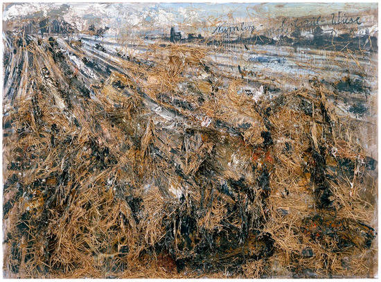 His relationship to nature is different from that of historical painting. According to Stiassny, Kiefer sees nature as a silent eyewitness who saw the horrors and actions but remained speechless. From the 1980s onwards, Kiefer attached materials such as straw, lead, hair, and sand, and these materials underwent processes of oxidation during exhibitions; his works were in a constant state of oxidation, exposed to the effects of time (Stiassny 2015, p. 50). The materials that Kiefer uses are therefore very contingent; they literally disintegrate even while they are in the process of being exhibited, thus indicating the dynamics of a relationship’s co-contingency and the absolute: contingency in their perishability and the absolute in their glimmer of hope. Hope does not refer to the present but is instead aimed at transcendence since hope is hope because it aspires to a transcendence of some sort (not necessarily a religious transcendence but transcendence as overstepping in general) and wishes for it. This method of painting is consistent with Kiefer’s assertion that paintings lack a clear ending, which is also one of the ways he deconstructs the historical painting subgenre.