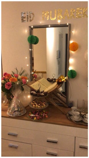 Samira is 22 years old and was born in Carinthia, Austria. She attended primary and secondary school there and graduated with the highest upper secondary qualification. She is now in the second semester of a technical mathematics degree in Graz. Her parents fled from Sarajevo to Austria during the Bosnian war. She was raised very religiously by her mother. Religion plays a large role for Samira, and she prays five times per day. Samira has many hobbies. She likes to bake cakes and surprise her family with creative gifts. She likes to travel to Bosnia with her family and spend her vacations there. She loves Bosnian food and the country’s coffee culture. Every day, she watches videos on Instagram and TikTok about Bosnian culture, religion, and spiritual texts and shares the content with her friends. Samira reports that the photograph she has chosen is very important to her. Every year at Ramadan, she says, she decorates a dresser with Muslim pastries. For her, it is a very special moment, when she lives her faith and makes it visible. She also shares that her family invites their neighbors to their home to celebrate Eid together. She notes that her neighbors bring flowers and homemade cakes. She is happy that people accept her religion and are interested in it (Figure 1).