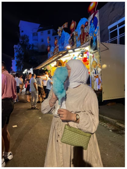 Esmira is 19 years old and was born in Carinthia. She attended primary and secondary school. She started vocational school but dropped out after two years, and she currently works in the production department of a technology company. Her parents fled to Austria from a small village during the Bosnian war. She has three siblings. She is married and lives with her partner on the Slovenian border. Esmira likes to attend fairs with her friends and enjoys smoking shisha with them. Her hobby is shopping for fashionable clothes. When she turned 18, Esmira decided to wear a headscarf. She is also trying to become an influencer, sharing her story and experiences. Explaining why she chose the photograph (Figure 2), Esmira describes people on the street telling her to take her headscarf off: “Get rid of that rag!” Esmira approaches such people and tries to explain why she wears a headscarf. Many assume that she was not born in Austria, and express surprise that she speaks native German. She approaches people in this way because she has experienced discrimination and exclusion, and things have sometimes been bad for her. However, she feels comfortable wearing the headscarf. She also chose the photograph because she likes going to funfairs.