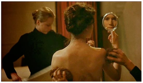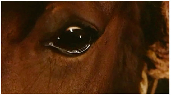 In a beautiful close-up of the film Lancelot du Lac (1974, dir. Robert Bresson), the eye of the camera pays attention to the eyes of Queen Guenièvre (Laura Duke Condominas) that are reflected in the mirror in which she herself is contemplating during the bath (Figure 1). Her face is reflected in her eyes; her eyes do not look directly at the viewer but, slightly transversally, question him through the scopic gaze (Jay 1993, p. 362). In a nocturnal sequence from the same film, we see the extreme close-up of the black pupil of Lancelot’s horse as we hear in voiceover: “The Grail eludes us”. (Figure 2).