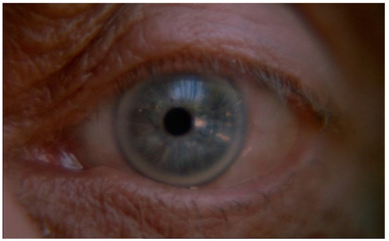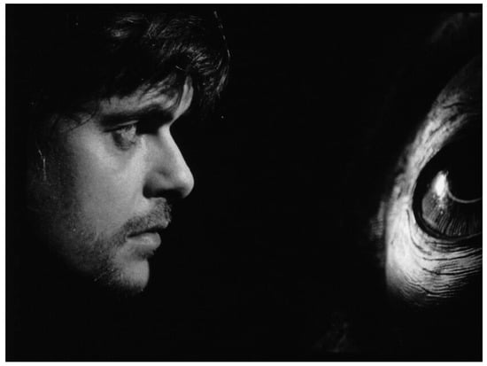 In an emblematic sequence from the mysterious, poetic, and allusive black and white feature film Werckmeister Harmóniák (Werckmeister Harmonies, 2000), a celebrated film directed by the prestigious Hungarian director Béla Tarr, we find yet another well-known example of this form of scopic vision, very similar to the shot of the eye of the horse in Lancelot du Lac that we have just discussed. Its protagonist, the young János Valuska, in the abyssal darkness of the box of a traveling circus truck transporting an enormous whale, in an almost initiatory scene, approaches the eye of the cetacean in close-up, as if seeking an answer to the impenetrable and inexplicable (Figure 4). Béla Tarr’s cosmic gaze turns this enormous black pupil into a mirror of the world in which all the horror of destruction and desolation is concentrated. At the same time, however, this shot makes the whale an image of the dark god of the Gnostics, an Absolute that is at once distant and close, “the visitation of the Stranger” (Louis Massignon), “the Absent One of history” (Michel de Certeau), an image of the unfathomable mystery, in whose black, tearful orb is reflected, poetically speaking, the man who looks and is seen. Indeed, a strange glow shines on the iris of the eye, as if from elsewhere—the radiance of the invisible. Valuska explains this in the memorable cosmological and visionary sequence in the bar at the beginning of the film: “infinite emptiness reign. And just imagine that in this infinite sonorous silence, everywhere is an impenetrable darkness”. “And then… complete silence”.