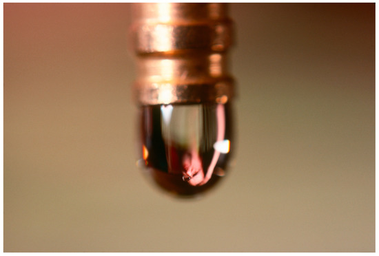 An early work by Bill Viola with clear references to Sufi gnosis is the video/sound installation entitled He Weeps for You (1976) (Lauter 1999, pp. 108–20; Hanhardt 2017, pp. 25, 42, 52, 53–58, 285; Hanhardt 2019, pp. 82–89). The elements of this work are: a drop of water from a copper pipe; a live color camera with a macro lens magnifying the image of the drop; an amplified drum; and video projection in a darkened room (Figure 5). The artist, through the water drop and the macro lenses, suggests a cosmological vision of the universe, establishing a relationship between macrocosm and microcosm. This idea is already present in another video installation with audio entitled Rain (1975), consisting of an amplified drop of water falling from the ceiling onto a metal surface that reflects the optical patterns of the wave on the wall; a black and white video projection of a live camera mixed with a previously recorded action; water-worn stones; and a heat lamp. In the macro reproductions of the work, He Weeps for You, the artist’s face is seen reflected in the drop of water. In a darkened space, a copper pipe runs down from the ceiling, terminating in a small brass valve from which a single drop of water slowly emerges. A live-color video camera, fitted with a special lens attachment used for extreme close-up magnification, is focused on this drop. The camera is connected to a video projector that displays the swelling drop of water on a large screen at the rear of the space. The optical properties of the waterdrop cause it to act like a wide-angle lens, revealing an image of a room and those within it. The drop grows in size gradually, swelling in surface tension until it fills the screen. Suddenly it falls out of the picture, and a loud, resonant sound is heard as it lands on an amplified drum. Then, in an endless cycle of repetition, a new drop begins to emerge and again fill the screen: