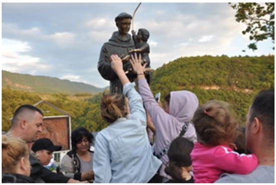 Caroli offers a range of practical details about the reconstruction of the shrine while trying to emphasize the brotherhood that would unite Albanian and Italian Catholics and Franciscans. A very remarkable development involved the placing of the relic inside the shrine, thereby resanctifying it. Furthermore, the transfer of the relic from Padua to Laç indicates the degree of cooperation between the Albanian and Italian Catholic communities, even if the role of the Albanian Catholic community is not fully clear. According to Clayer (2003), at that time, the Catholic Church was highly centralized under the management of authorities directly appointed by the Vatican. Among them was Rrok Mirdita, the Albanian from Montenegro who was appointed by John Paul II (1920–2015) as the archbishop of the Archdiocese of Durrës–Tirana in 1993. Mirdita’s inauguration of the shrine suggests a degree of governance by central Albanian Catholic authorities, bolstered by Vatican officialdom. However, further investigation is needed concerning the role of the Franciscan communities and the Catholic ground-level milieux.