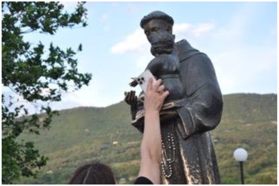 Continuing on, one reaches the main square, which is bordered on the left by a building for confessions, at the bottom of which is an open-air altar where Mass is celebrated on feast days. On 13 June this area is set up with movable benches and chairs to allow the thousands of pilgrims to participate in the liturgy. There is also a very simple chapel, which welcomes pilgrims of all religions. It contains a single nave, wooden benches, and a small altar (see Figure 2) and its bare walls have small wooden crosses attached, equidistant from each other, that make up a Way of the Cross, along which pilgrims walk, touching or rubbing objects and clothes. The statue of Saint Anthony (see Figure 3), located in front of the building used for confessions, captures the attention and prayers of all who come. It is a very simple bronze statue on a pedestal. At the far end of the square, the monastery complex, where the community of Franciscan monks is based, dominates the valley.