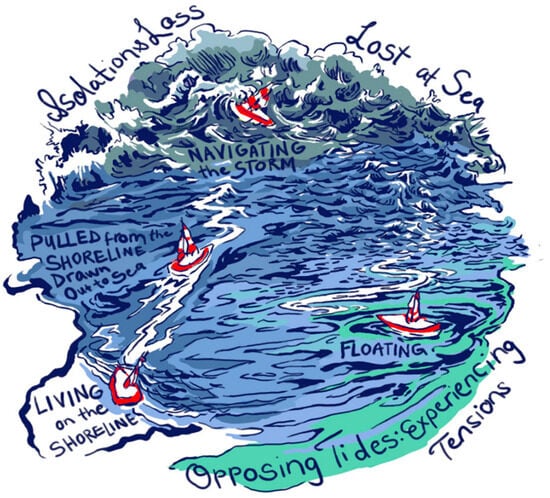 The participants each described their SD journeys as wrought with tensions and paradoxes that they have navigated and continue to navigate in their ongoing processes towards finding a more spacious spirituality in deeper congruence with their values. This IPA study explored the phenomenon of SD and highlighted voices of lived experience in the hope of strengthening understanding. Through semi-structured interviews with four women of EC backgrounds, conducted over Zoom due to the COVID-19 pandemic, narratives of spiritual wrestling unfolded. The women described their SD narratives as a process, depicted through a non-linear, ocean-themed metaphor (Figure 1). The process included at-times traumatic existential and relational storms, as the women felt pulled from the stability of the familiar EC shoreline into the untethered waves of the unknown. A sense of existential tension, or opposing tides, as well as isolation and loss were identified as ebbing and flowing undercurrents throughout their SD journeys.